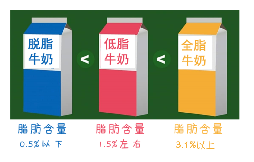 在我国,全脂牛奶(Whole Milk)的脂肪含量在3.1%左右;脂肪含量不大于 0.5% 被叫做脱脂牛奶(fat free milk、skim milk、nonfat milk),而脂肪含量不大于 1.5% 的牛奶被称为低脂奶(low fat milk),也就是很多人说的半脱脂牛奶。
