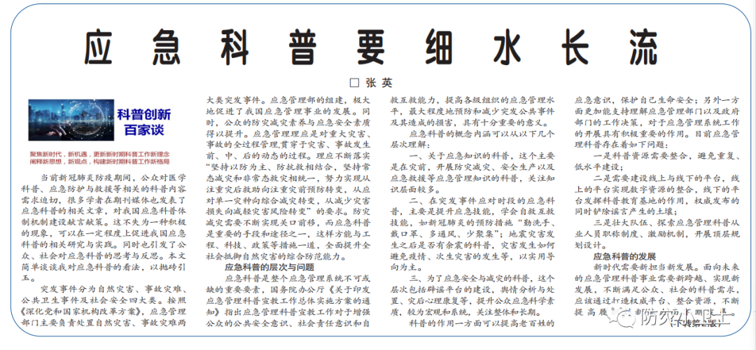 当前新冠肺炎防疫期间,公众对医学科普、应急防护与救援等相关的科普内容需求迫切,很多学者在期刊媒体也发表了应急科普的相关文章,对我国应急科普体制机制建设献言献策,这不失为一种积极的现象,可以在一定程度上促进我国应急科普的相关研究与实践。同时也引发了公众、社会对应急科普的思考与反思。本文简单谈谈我对应急科普的看法,以抛砖引玉。