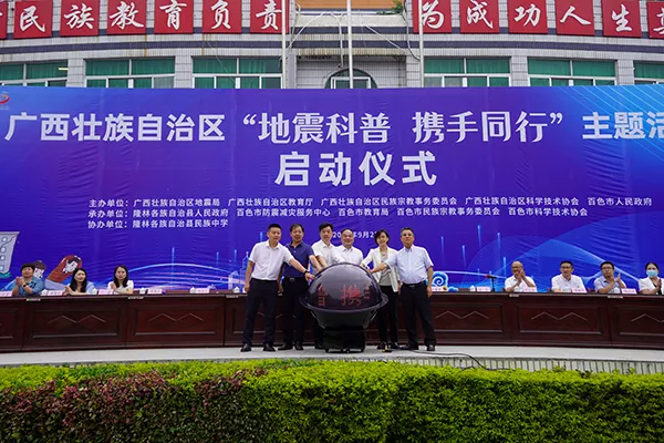 9月22日,广西“地震科普 携手同行”主题活动启动仪式在隆林各族自治县民族中学举行,自治区地震局、教育厅、民宗委、科协、百色市人民政府领导及2000多名学校师生代表参加了启动仪式。自治区地震局党组书记、局长黄国华宣布活动正式启动,标志着为期4年的广西壮族自治区“地震科普 携手同行”主题活动正式拉开帷幕。自治区科协党组成员、副主席何求在启动仪式上讲话,呼吁协同做好新时代防震减灾科普,提升公众科学防震减灾意识和自救互救能力。开展“地震科普 携手同行”主题活动是构建防震减灾科普社会化格局的一次重要尝试,也是促进民族团结进步,补齐民族地区学校在防震减灾知识、特别是防震减灾技能方面短板的迫切需要。广西作为民族团结的示范区,将通过“1年试点、3年推广”,力争用4年时间,向全区10458所中小学校、中等职业学校捐赠40万册图书,开展10000场次科普讲座,举办10000场次应急演练,培养10000名防震减灾科学传播师。