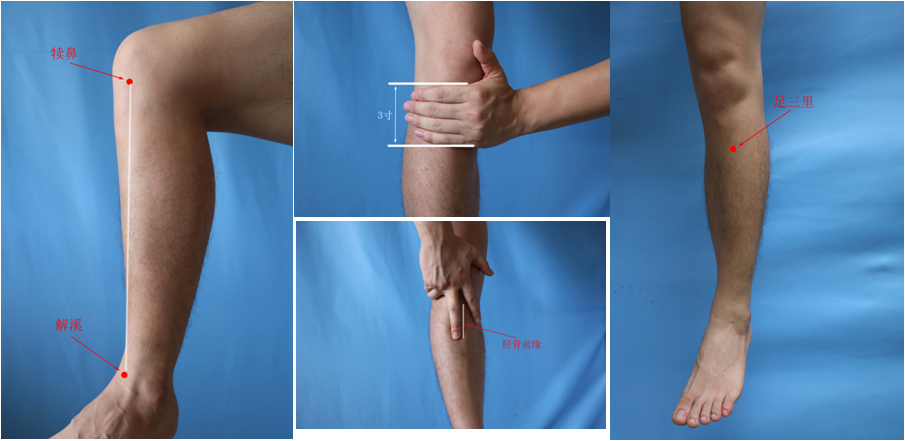 【定位】:小腿外侧,当犊鼻与解溪的连线上,犊鼻穴下3寸,胫骨前缘旁开一横指。