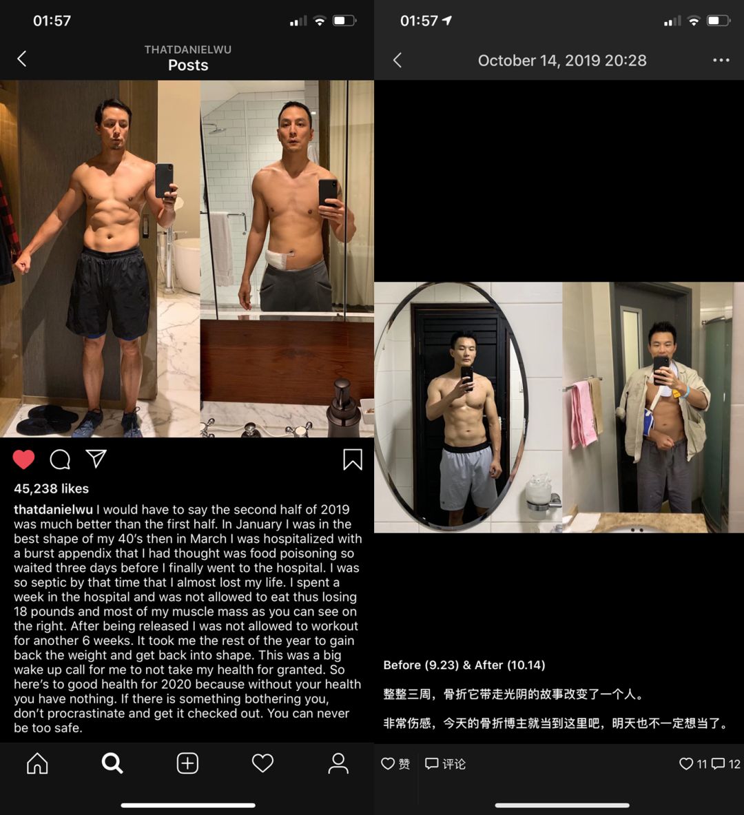 2019 年的最后一天,吴彦祖在 Instagram 发了他生病前后的对比照,提醒大家要珍惜健康。为了蹭他这个热度,我早在国庆长假就提前摔断了锁骨,并且在住院期间发了高度神似的两张自拍。