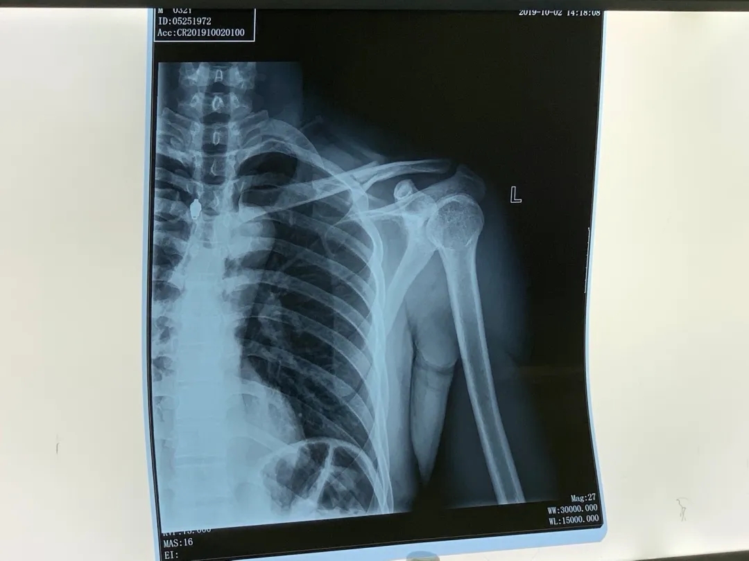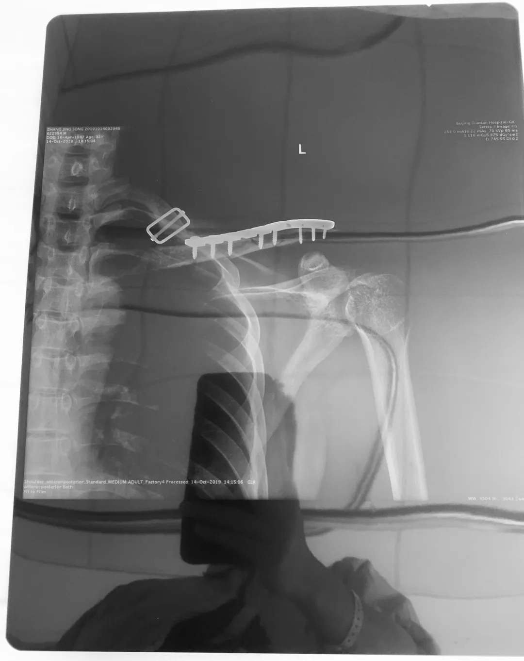蹭吴彦祖热度丨作者供图 美好的假期刚开始,我摔了一跤 骨折显然不在我的国庆节计划内,原计划是到上海参加一个音乐节,看三个展,见几个朋友。我提前预订了高铁和酒店,买完了门票,和朋友约好。万事俱备,美好的假期在等着我。 时间回到 10 月 2 号,计划去上海的前一天。作为全北京自行车 500 强选手,我约了朋友去郊区骑一条著名的路线“东大高”(东方红隧道-大村-高崖口)。一路上我爬坡、压弯、在路边停下来自拍……眼看着要到终点,却在最后一段路的一个弯道遇到了逆行的汽车。 (此处开始 slow motion)千钧一发的时候,我向路右边躲避,闪过了汽车,撞到护栏上又弹回路中间。人、车、手机,分成三个方向飞出去,人翻滚着落地,爬起来跑去捡起手机,抬起手肘检查蹭破的伤口时,左肩深处一阵刺痛。 我坐在路边等朋友从山下开车过来,两个多小时后终于被送到了医院。 锁骨断成了三截 拿到急诊X线片的结果,我自己都能看出来左边锁骨是童叟无欺地断了,成了三截。我右手扶着左臂,呲牙咧嘴地拿着片子回去找医生,等待接下来的安排。 医生看完片子,肯定了我锁骨骨折的猜测,在手术和保守治疗之间建议我选择保守治疗。保守治疗,在我看来就是不治疗,从外面固定住,回家每天对着骨头说一些赞美的话,等它自己长好。 当然最后怎么选还是要我自己决定。反正假期不能安排手术,我又对手术充满恐惧,于是欣然接受了保守治疗的建议。我绑上一个背背佳一样的东西,领了一盒止疼片回家静养去了。 左侧锁骨断了丨作者供图 静养的一周,每天迷迷糊糊睡了又醒,清醒时想一想怎么以“骨折博主”的身份出道。大部分时候没什么感觉,偶尔疼的时候吃一片止疼片。那些宣称自己热爱平躺的人,真的,你们连续平躺一周试试吧,反正我才躺了几天,半边屁股已经压麻了。这一周里,我最大的愿望就是可以侧躺(第二个愿望是可以一下就把裤子脱到底)。 后面几天我会艰难地起床,艰难地下楼买咖啡,披上大衣托着受伤的手臂。风起的时候,怀念我的玄铁重剑和又大又丑的神雕。失去才会珍惜,连转头都需要用手辅助的时候,我才知道除了衬托锁骨链之外,小小的一根骨头竟然还有这么重要的作用。 复诊,还是要做手术 躺了一周后,我去另一家医院复诊。门诊医生看了片子厉声质问:为什么不做手术! 既然想当骨折博主,这几天里我当然没有闲着,查了资料,也咨询了医生朋友,简单总结出手术和保守治疗的利弊: 手术的好处: 1. 恢复快,刀口愈合后差不多就可以生活自理(脱裤子自然也不成问题); 2. 恢复效果好,钢板固定比外固定更稳,愈合后骨头的形状更接近之前的状态,不用担心长歪了美少女们会不喜欢,对运动功能的影响也更小; 3. 顺便得到一条酷酷的蜈蚣纹身。 而保守治疗的好处只有一条:不用做手术。 虽然早就知道该怎么选,但是面对医生的问题时,脑海中还是响起了悲壮又坚毅的背景音乐。接下来的一切都像是流水线操作:办好手续,当天住进医院,重新拍了片子,抽血化验(他们用的针好疼!),等待两天后的手术。 住进病房,条件比我想象中要好,三张病床,有独立卫生间,甚至可以洗澡。朝南的窗台上摆着几盆护工师傅养的盆栽,有一些正开着花,让我稍微安心了一些。 一夜无话,第二天也无话。活了 17 年,从验血报告里第一次得知自己的血型是 A型,也不知道和我的性格是不是相符。下午麻醉医生过来问了一些常规问题。“咱们是全麻,”南方口音的女医生临走时扭回头对我说,“什么感觉都没有,你不用紧张的。”听完的确放松了一些,不知道这是例行的安慰,还是她看出了我的紧张。 傍晚时简单地擦了澡,晚上10 点以后禁食禁水,我(精神上)辗转反侧,身体就像一条咸鱼。 手术日来了,全麻真好 转眼到了第三天,手术的日子。我是当天的第一台手术,一早就被两个人连床一起推走。仰面看了一路的天花板,经过两道自动门,被门里面的人接手,开始帮我做准备。如果我是一块牛排,现在就像seasoning 阶段。 准备过程中,一个医护小伙子问我是怎么受的伤,并表示他也喜欢骑车,说等我好了相约去戒台寺。真的,要不是他为刀俎我为鱼肉,我当时就想跳起来弹他脑壳。另外从他们的闲聊中得知,等下有一台手术是换膝盖,隔壁房间是开颅切什么东西。他们说得轻描淡写,我听完觉着你们快扶我起来,我还能扣篮。 大概等到 8 点多,喜欢骑车的小伙子往我脚上扎了一针,一股药水冲进小腿。麻醉医生把面罩扣在我脸上,我随即失去意识,再醒来已经是 11 点,肩膀包得很严实,根本不知道发生了什么。 啊,全麻,我赞美全麻。 身上四个管子,第二天就下地 我躺在旁边被观察了一个小时后回到病房。身上插着四个管子(氧气、引流、尿管、输液),神志清醒,身体上的感觉逐一回归。喉咙里有插管留下的擦伤,嘴唇干裂,又不让喝水,伤口隐隐作痛,我知道该睡觉但是睡不着……这六个小时才是真正的煎熬。 到了晚上,拔掉脚上的针才迷迷糊糊睡过去,心里想着一早醒来又要抽血,也睡不安稳。 第二天醒来感觉好多了,抽血,重新扎针输液,拔尿管。手术当时虽然没有痛苦,但拔尿管让我倒吸了一口凉气。想到拆钢板时还得这么来一遭,梅花就落满了南四环。拔完后我躺着缓了许久,扭头看着肩膀上的引流管恍然大悟——这就是牛排煎好了,要拿出来放血水了吧。 护士叮嘱我尽早活动,于是我中午就