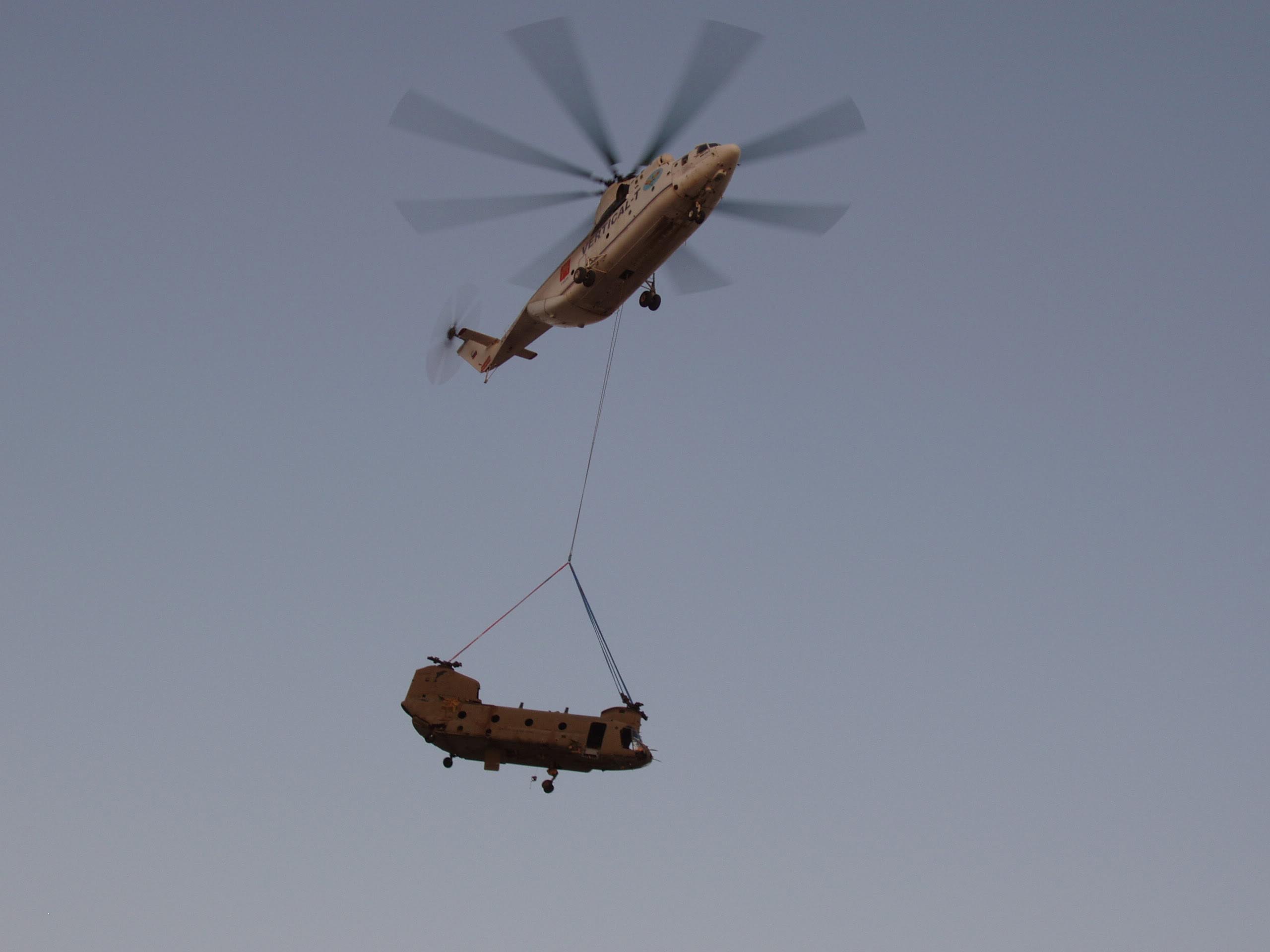 ▲ 吊运CH-47直升机机身的米-26直升机。