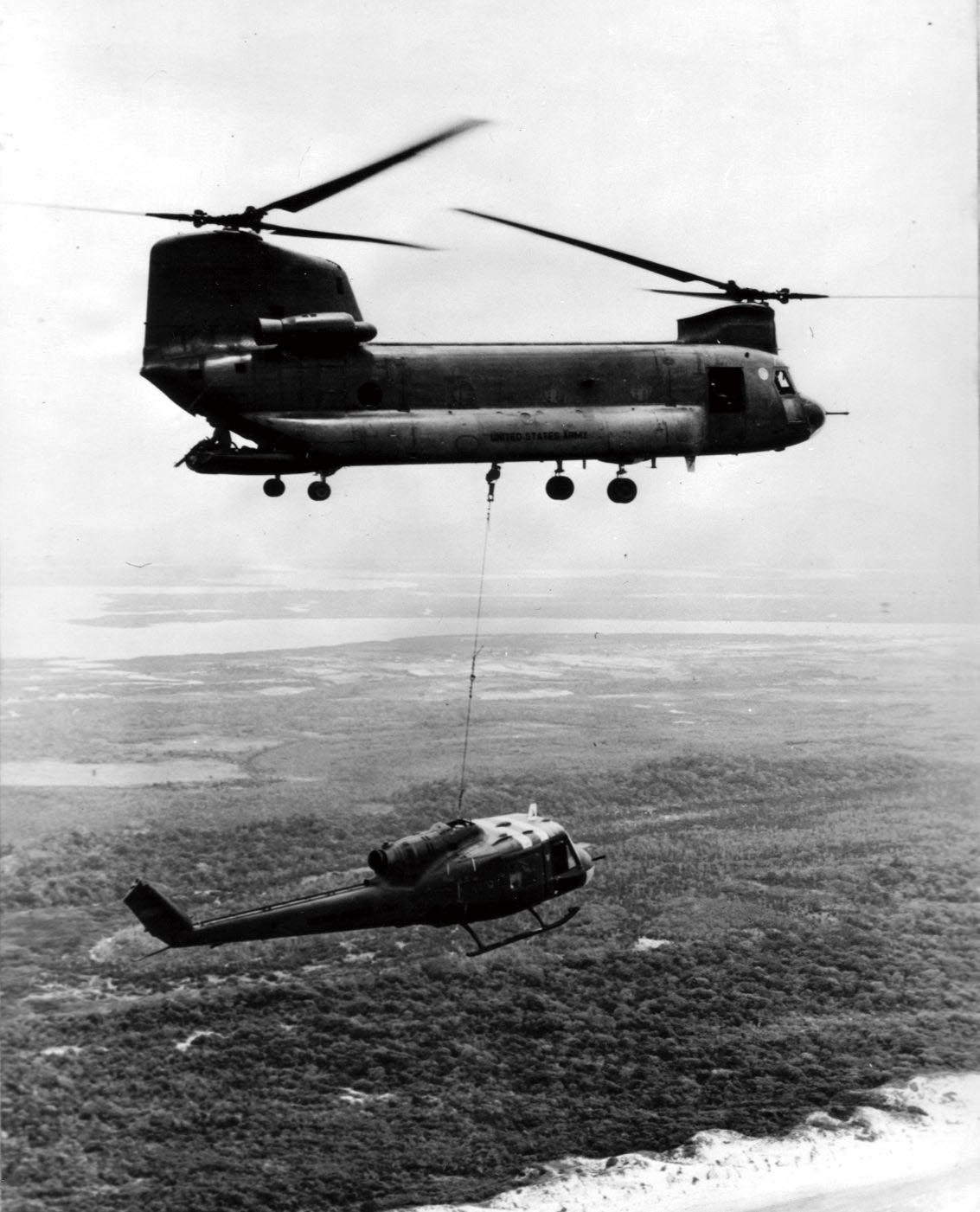 ▲ 吊运UH-1直升机的CH-47直升机。