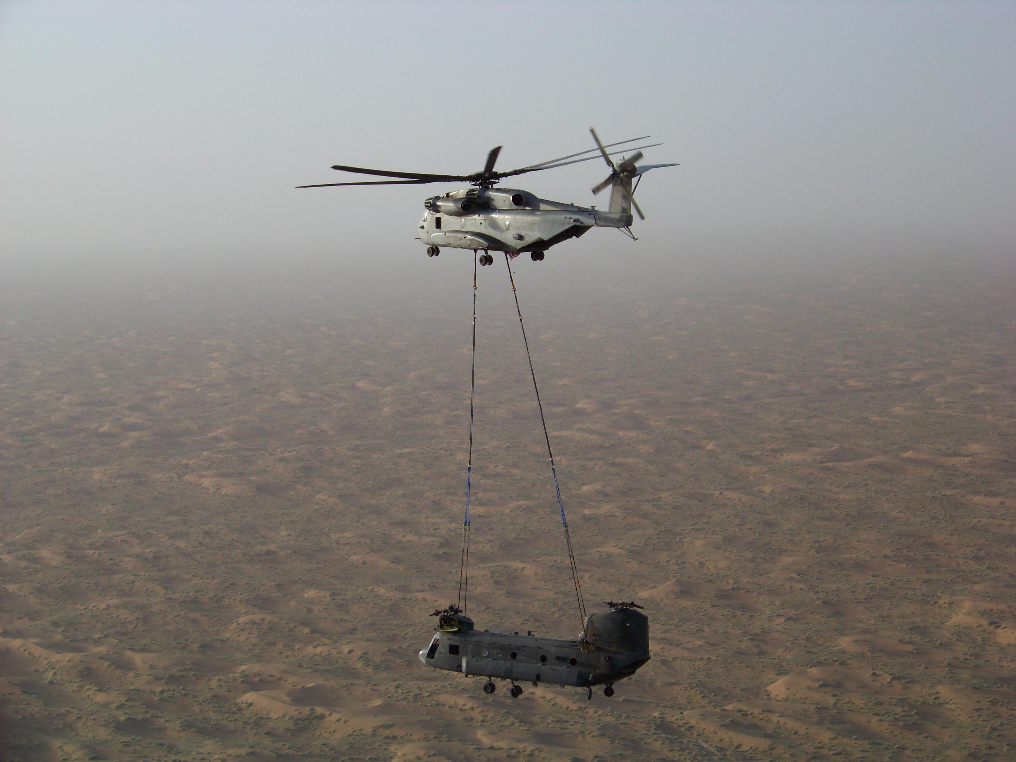 ▲ CH-53直升机吊运CH-47直升机。