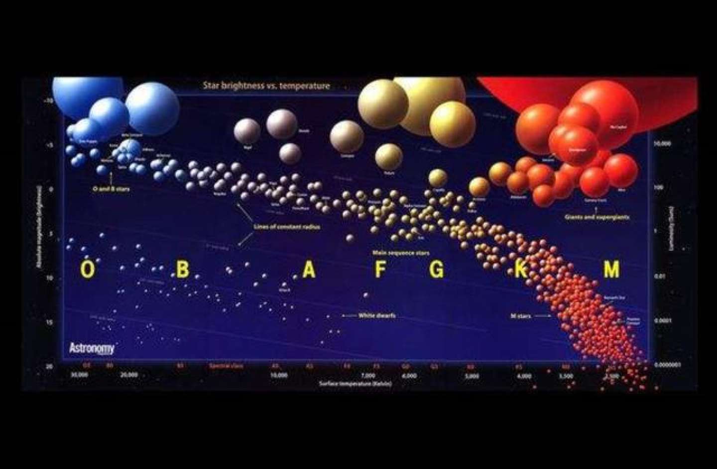 恒星分类基本是按光谱分的,因为质量越大的恒星亮度就越高,因此实际上也是根据质量来划分的。银河系恒星光谱分类为O、B、A、F、G、K、M等7个类型,这些类型是按恒星表面温度和亮度从高到低排列。