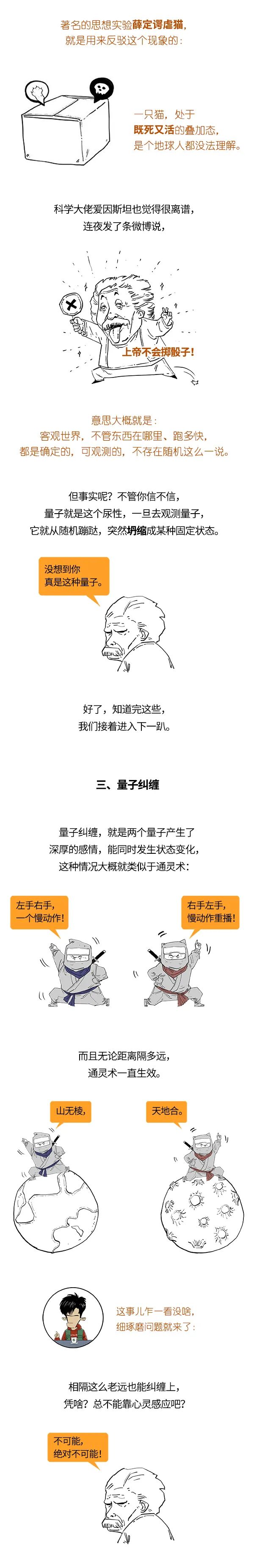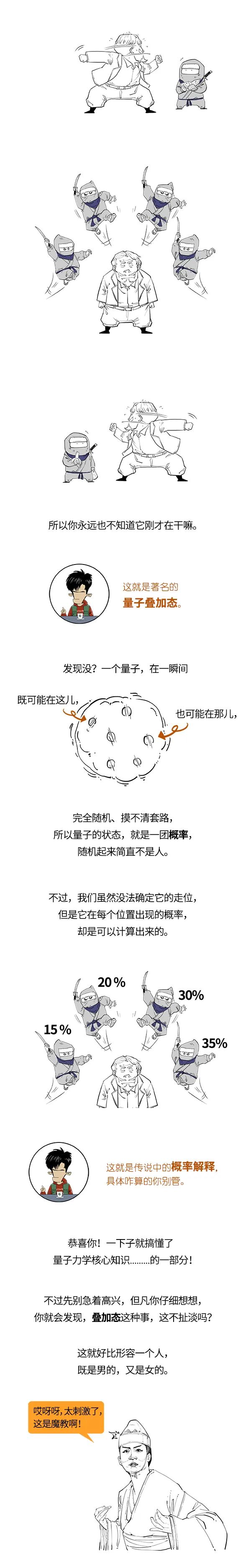 不管什么东西,在哪里、跑多快,都是确定的,能观测出来,就像这样:但在量子的微观世界里,各种不靠谱就来了:量子,物理学界的终极网红,因为它见光死!量子实在太小了,任何一个干扰都会影响它,连光照上去都会被砸到懵圈,所以如果你看一眼它,刚还在自嗨地随机蹦哒,忽然就消停下来一脸无辜,种情况大概就类似于分身术,真神奇。