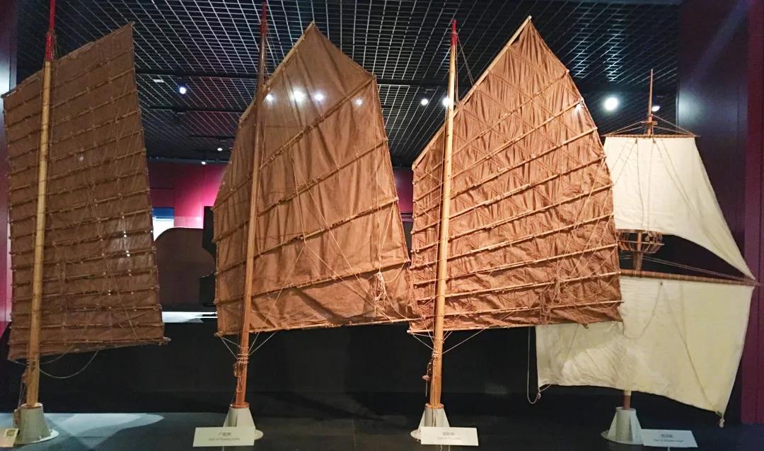 相对而言,西方船多仿鱼为船型,中华船多仿水鸟为船型,呈现首尖且线型流体特征。就船帆而言,西式帆多为三角或方形软帆,而中式帆多为百叶帘式,且带竹、木撑条,是由麻布或竹席制成的矩形或扇形可升降和折叠的硬式帆蓬。中国航海博物馆藏有大量中式与西式船模,清晰地展示了中西方帆船的不同。