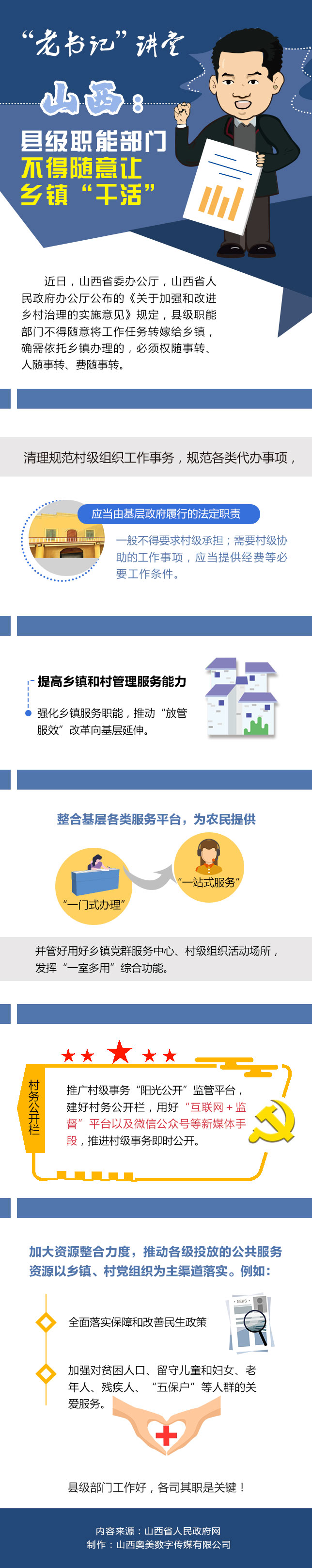 近日,山西省委办公厅、山西省人民政府办公厅公布的《关于加强和改进乡村治理的实施意见》规定,县级职能部门不得随意将工作任务转嫁给乡镇,确需依托乡镇办理的,必须权随事转、人随事转、费随事转。