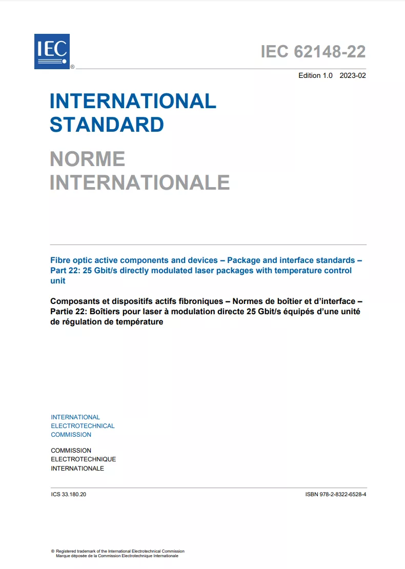 近日,由中国电子技术标准化研究院联合中国信科集团制定的《光纤有源元件和器件-封装和接口标准 第22部分:带温度控制单元的25Gb/s直接调制激光器封装》(简称《标准》),日前由世界三大标准组织之一的国际电工委员会(IEC)正式发布。该《标准》的发布也是光通信有源器件领域第一项由我国主导制定的IEC国际标准。
