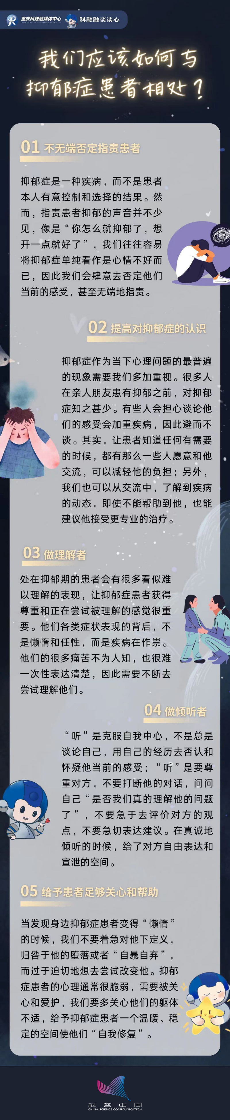 **如果我们身边的朋友和家人患上了抑郁症,如何帮助他们走出情绪泥潭?**罗捷主任总结了与抑郁症患者的这些相处方式: