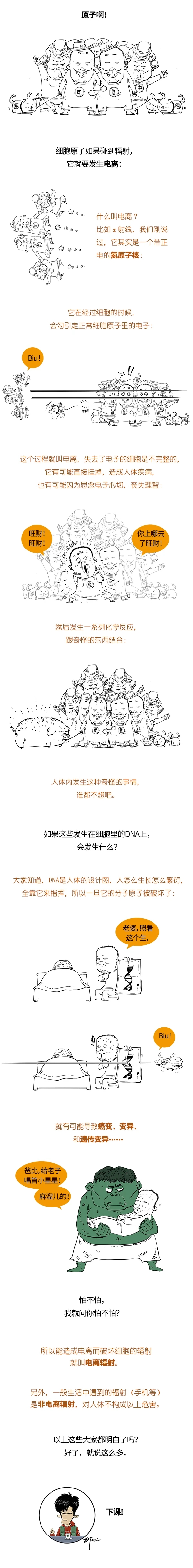 能够造成电离而破坏细胞的辐射叫做电离辐射,而生活中遇到的辐射(手机、微波炉)是非电离辐射,对人体不构成严重危害