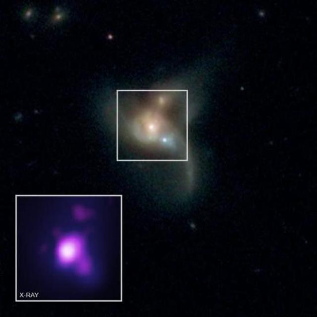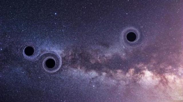 黑洞相撞后会融合在一起,在没有融合前会相互围绕着旋转,形成双黑洞或三黑洞。如科学家们发布的一项研究报告称,在距离我们10亿光年的SDSS J084905.51+111447.2星系系统中,发现了三个正在碰撞融合的黑洞。这三个黑洞分属三个不同星系,星系合并使这几个黑洞也发生相撞并将融合在一起。