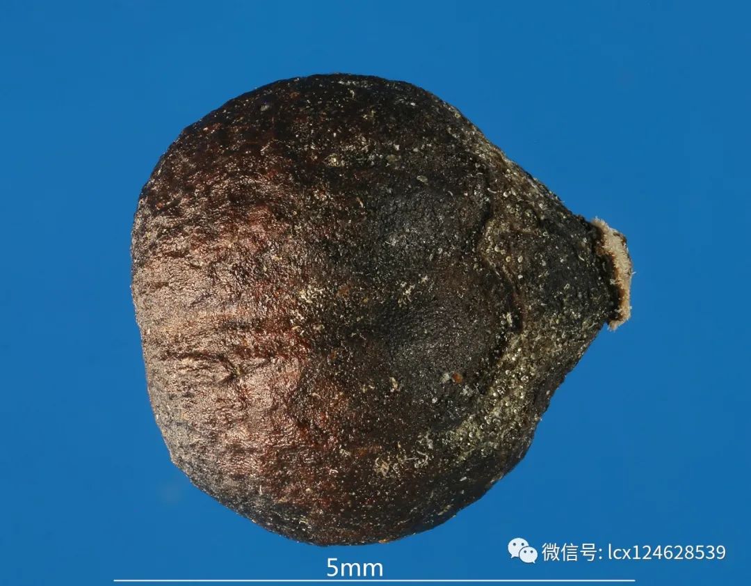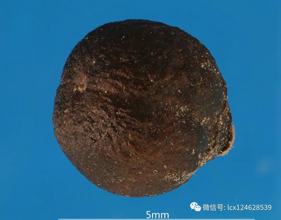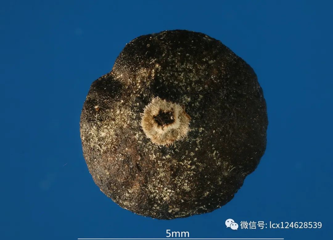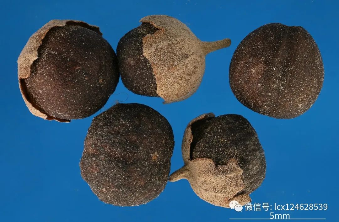 4、核果近球形,直径约5毫米,表面具多条不规则的粗纵棱,成熟时黑褐色,基部凹陷,端部有一不规则椭圆形微凹,花萼宿存,具多条纵棱,表面密被灰白色绒毛。