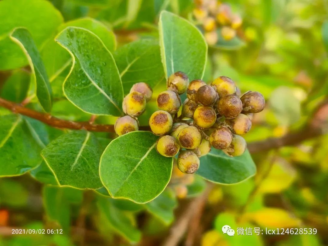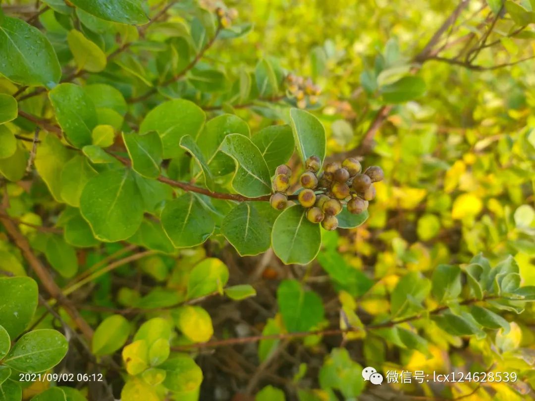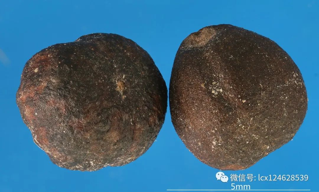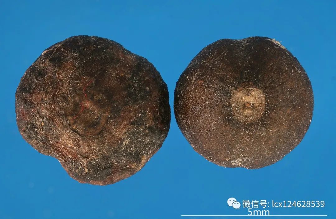 4、核果近球形,直径约5毫米,表面具多条不规则的粗纵棱,成熟时黑褐色,基部凹陷,端部有一不规则椭圆形微凹,花萼宿存,具多条纵棱,表面密被灰白色绒毛。