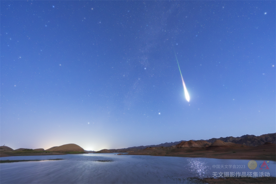 2023年中国天文学会系列科普活动天文摄影作品征集活动之星野摄影组,作品名称《2023英仙座大火流》,作者为梁国威,拍摄时间:2023年8月12日,拍摄地点:甘肃省嘉峪关黑山湖畔。