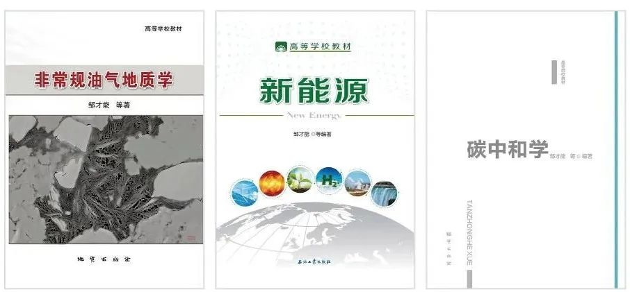 ▲邹才能等出版的《非常规油气地质学》《新能源》《碳中和学》3本专著