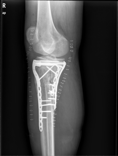 1. 拍摄膝关节X光片复查,并根据骨折线愈合情况及专业医生建议决定是否开始进行患肢负重练习。