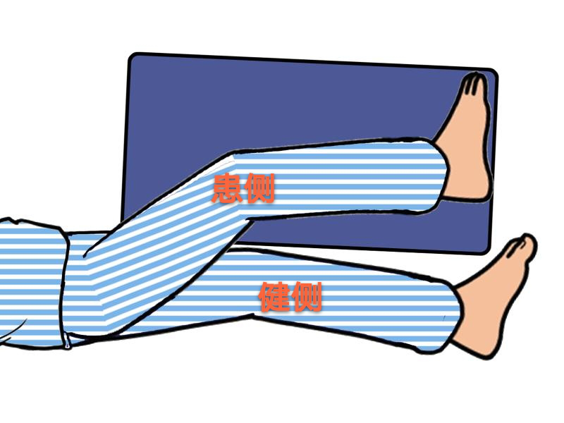 2.侧卧位:健腿在下适当弯曲,双腿间放置枕头(枕头要足够蓬松且长度超过小腿),患侧腿借助枕头垫起呈向外轻度打开的状态(高于心脏)。