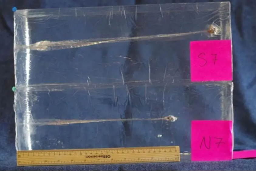 不经假体(上)与经过假体后穿入弹道凝胶(下)的子弹轨迹 | Pannucci CJ et al