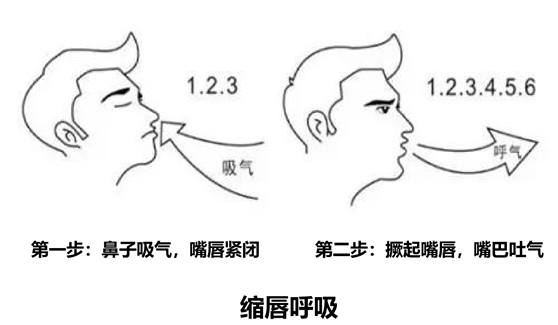 用鼻子平静地吸,然后在吐气的时候把嘴撅起来,缓慢地把气吐出去。在吸气的过程中默数1、2,吐气的时候默数3、4、5、6,如果可以的话可以默数到7、8,这样让吸与呼的比值达到1:2-1:4。缩唇呼吸可以延长吐气过程,减低呼吸频率,可以减少呼吸做功,同时也可以增加新鲜空气的吸入量,放松全身的肌肉,也能够改善患者缺氧,并降低二氧化碳潴留。同时做缩唇呼吸,也可以锻炼胸壁的肌肉,提高腹部肌肉的活力,并且减少氧耗,降低并改善膈肌疲劳。
