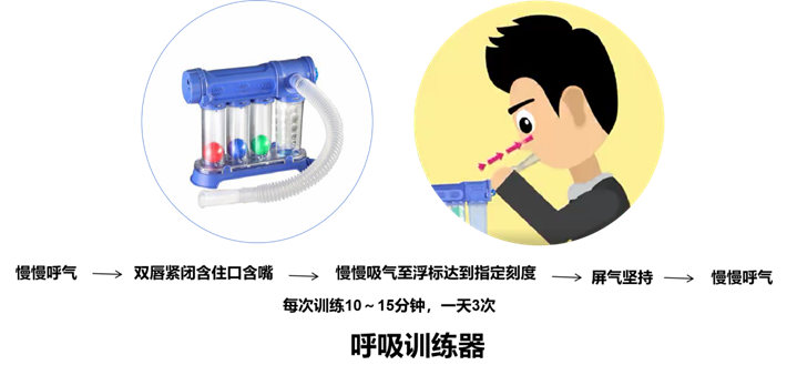 取坐卧位,一手持呼吸训练器,一手持口含嘴,慢慢呼气后,双唇紧闭含住口含嘴,以平稳的速度经口慢慢吸气,呼吸训练器的浮盘被吸上来,当浮盘到达指定刻度时暂停呼吸,让浮盘停留,尽量长时间保持,再由嘴慢慢呼气,每完成一次呼吸功能锻炼后应休息几秒钟然后再循环进行训练,一般每次训练10~15分钟,一天3次。
