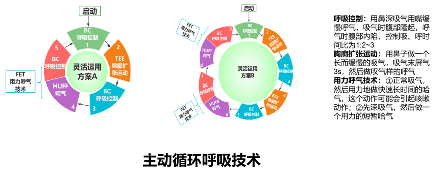 主动循环呼吸技术由呼吸控制、胸廓扩张运动、用力呼气技术三个关键部分反复循环组成。三步骤的训练顺序及次数不定,根据患者病情进行灵活调整,但不可缺少。每天可以做2-3次的主动循环呼吸训练,每次10分钟。