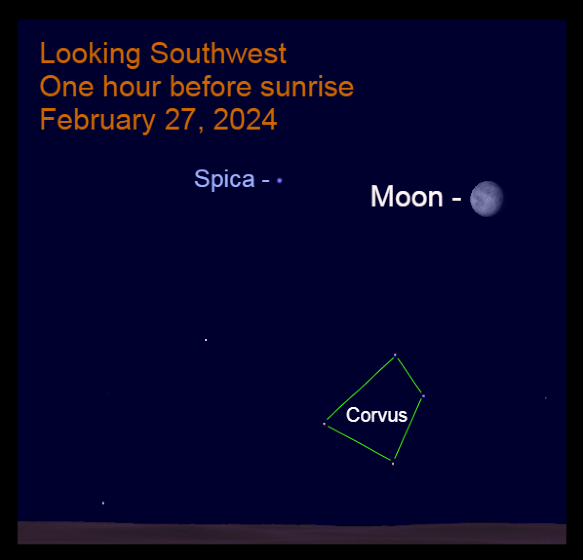 2024年2月27日:月亮接近角宿一(室女座α星)。这一对天体将在日出前和夜间晚些时候被观测到。