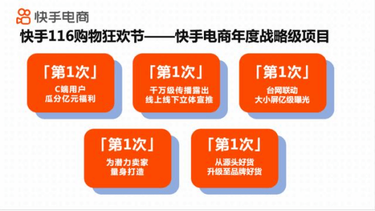 快手电商营销中心负责人张一鹏称,快手116是第一次旗帜鲜明的做中小卖家赋能购物狂欢节,今年116期间快手电商拿出了上亿现金补贴和10亿级流量专门扶持中小商家。