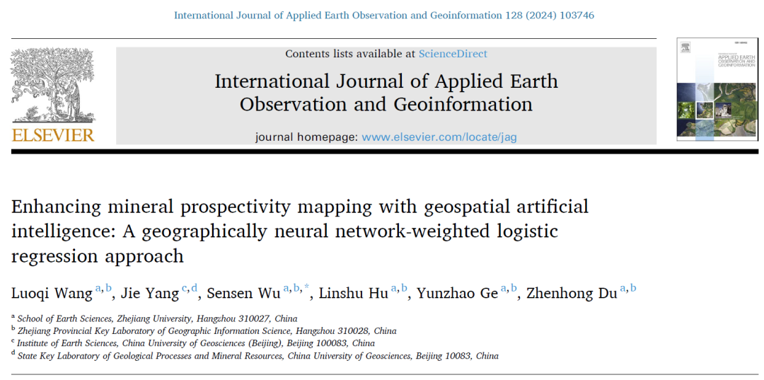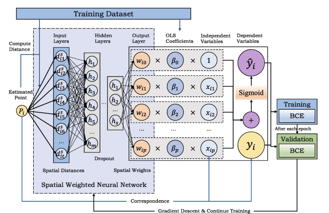 为了提升成矿预测模型的可解释性,以及成矿过程中因地质因素导致的空间非平稳性,浙江大学的研究团队提出了一种新的地理空间人工智能方法——地理神经网络加权逻辑回归 (geographically neural network-weighted logistic regression, GNNWLR)。