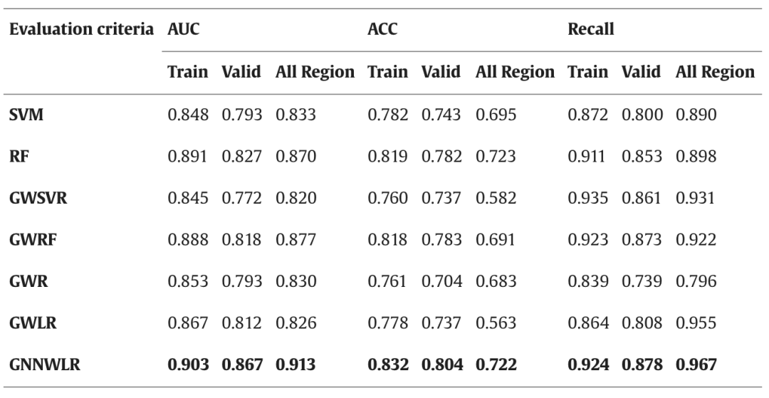 在该研究中,研究人员还针对目前最为常见的地理加权回归 (GWR)、支持向量机 (SVM)、随机森林 (RF)、地理加权逻辑回归 (GWLR)、地理加权支持向量回归 (GWSVR)、随机森林 (GWRF) 模型进行比较。