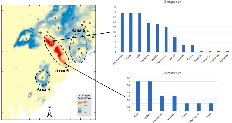 通过对不同区域不同特征的矿化影响进行评估,该研究发现「区域 4」的矿化与背斜和 Pb 强相关,「区域 5」存在两个矿藏,其中北部矿床受 Cu、Pb、Zn、As 四种元素的积极影响,表明该低区同时具有中温热液和低温热液成矿作用;南部矿床受到 Zn 和 As 的正向影响,表明其中以中温热液为主。
