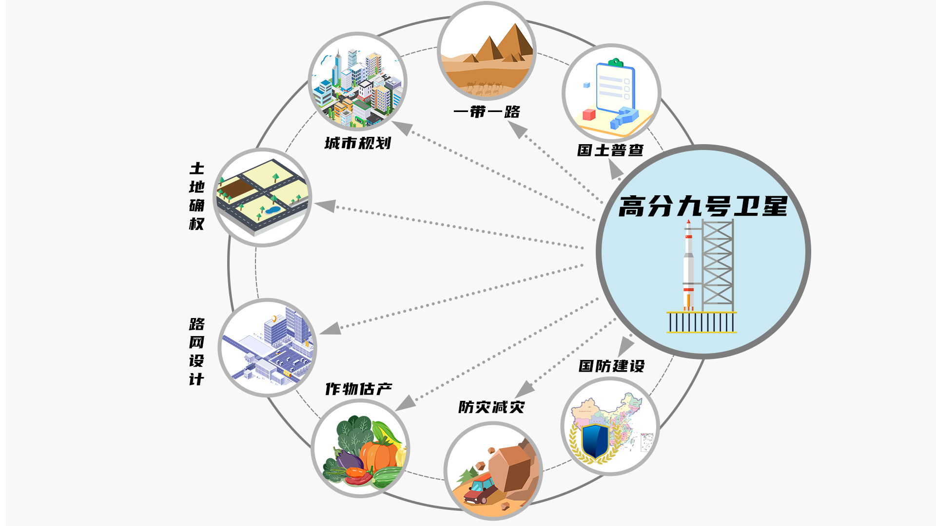 高分九号卫星作为光学遥感卫星,即通过携带可见光、红外线和多光谱等遥感器的对地观测卫星,地面像元分辨率最高可达0.5米,主要应用于国土普查、城市规划、土地确权、路网设计、农作物估产和防灾减灾等领域。另外,在“一带一路”等国家重大战略实施和国防现代化建设中,高分九号也在提供信息保障。