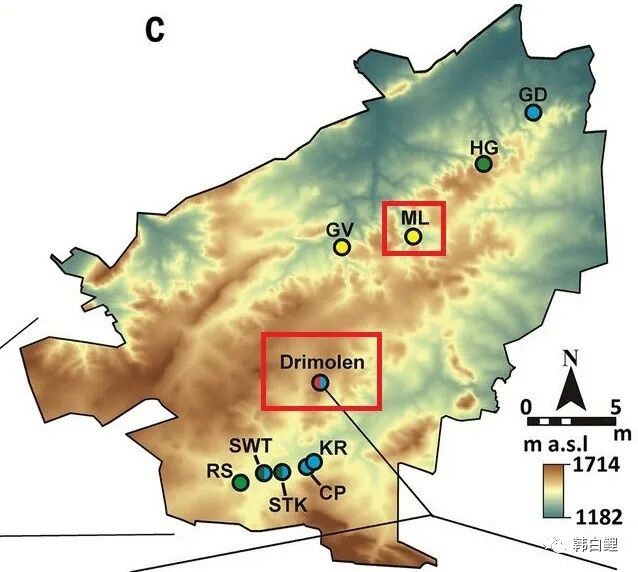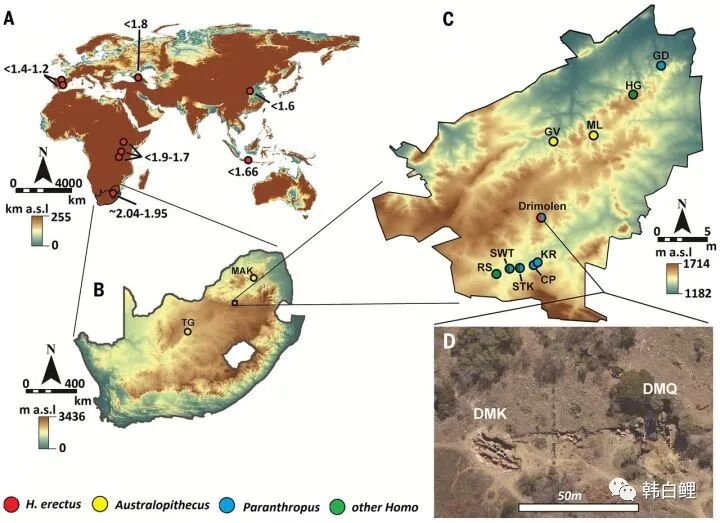 A-C南非德里莫伦(Drimolen)的位置;D德里莫伦(Drimolen)两处洞穴鸟瞰图;C 几处重要的考古遗址:马拉帕(ML)、升星洞(RS)等;图示圆圈颜色分别代表:红色-直立人(H.erectus),黄色-南方古猿(Australopithecus),蓝色-傍人(Paranthropus),绿色-其他人属