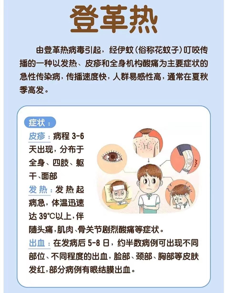 ①登革热(俗称“断骨热”)是一种由登革病毒引起的急性传染病,通过媒介伊蚊叮咬传播,属乙类传染病。广泛流行于全球热带、亚热带地区,我国南方省份常见于5-11月流行,高发季节为雨季及雨季后(8-10月)。因为这一时期气候潮湿温暖,为蚊虫的滋生提供了理想的环境。除了登革热,蚊子叮咬传播的疾病还有乙脑、疟疾、黄热病、丝虫病、寨卡病毒病和基孔肯雅热等。