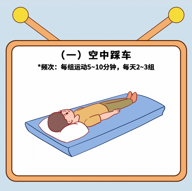 患者平卧,双腿伸直后屈膝抬高,使双腿悬空,上半身保持不动。接着,双腿在空中交替做踩踏自行车的动作,确保每次踢出时腿完全伸直。这个动作有助于增强下肢肌肉的力量和关节灵活性。