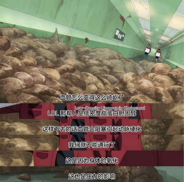 接下来,男主角在运输氧气的途中又见到了另一个场景——由肝脏产生并被“非法”倾倒的LDL低密度脂蛋白。低密度脂蛋白负责运载胆固醇进入外周组织细胞,它可被氧化成氧化低密度脂蛋白。当低密度脂蛋白,尤其是氧化修饰的低密度脂蛋白过量时,它携带的胆固醇便积存在动脉壁上,久而久之就容易引起动脉硬化。因此,低密度脂蛋白也被称为“坏胆固醇”。过多低密度脂蛋白的产生会导致冠心病、脑卒中、动脉粥样硬化等诸多疾病,而造成其过高的原因主要就是饮食结构不合理、暴饮暴食、精神压力大、缺乏运动等。