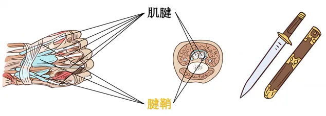 肌腱,就是我们老百姓口中的“筋”,它广泛的存在于我们身体的各个部位,负责我们肢体的活动;而腱鞘,则是包绕在肌腱周围的组织,可以保护肌腱减少磨损。它两的关系就好比宝剑与剑鞘,相辅相成。
