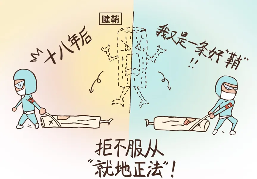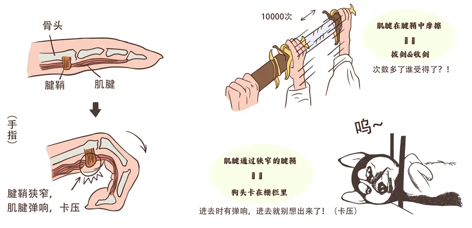炎症就好比反复做拔剑与收剑的动作后,剑鞘出现的磨损,拔剑收剑不再丝滑;而狭窄则是腱鞘增厚,使肌腱无法顺利通过,就好比狗头卡在了栅栏上,动弹不得。(上右图所示)