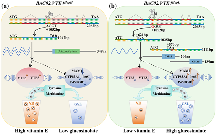 研究团队克隆出目标基因 BnaC02.VTE4 ,发现其第二个内含子其中一个剪接位点上A到G的碱基变异是导致油菜籽维生素E和硫苷含量差异的直接原因,研究还阐明了维生素E和硫苷生物合成通路对底物的竞争关系,揭示了正向调控维生素E和负向调控硫苷含量的分子机制,有助于实现油菜籽高维生素E和低硫苷综合改良的育种目标。