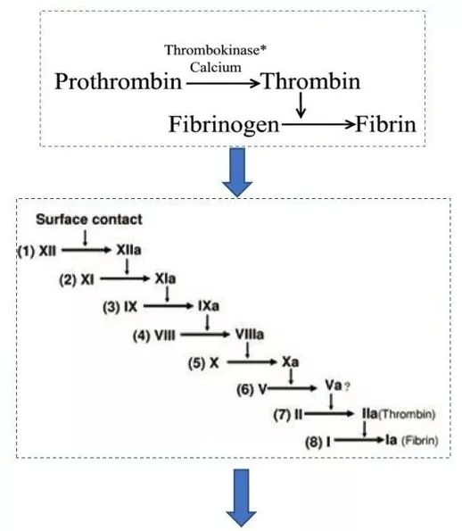 图1. “凝血瀑布”,凝血因子 (下标a表示活化状态) 级联反应