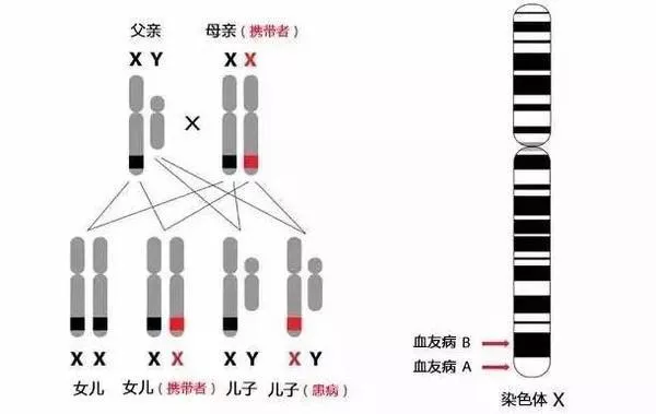 血友病A和B为伴X隐性遗传疾病,通常女性为携带者,而男性为发病者。据说,在19世纪由于维多利亚女王的后代把血友病传播到欧洲皇室,间接拖垮了俄国皇室(这就是历史上的“皇家病”)。