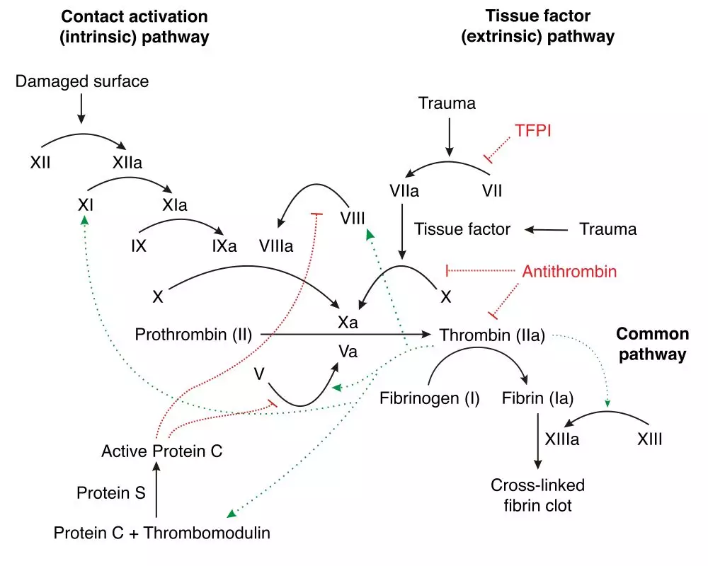 在科学家眼中,凝血过程可不只是止血棉球或凝血块,而是图1的样子(下标a表示活化状态,activated)。像其它体内信号通路一样,凝血过程有着精妙的调节,被形象地称为“凝血瀑布”;其生物化学实质是血浆中的凝血因子的一系列酶反应,上游因子活化其下游因子,最终凝血酶原(FII)转变为凝血酶(FIIa),后者将可溶性纤维蛋白原(FI)变成不可溶的纤维蛋白(FIa)。