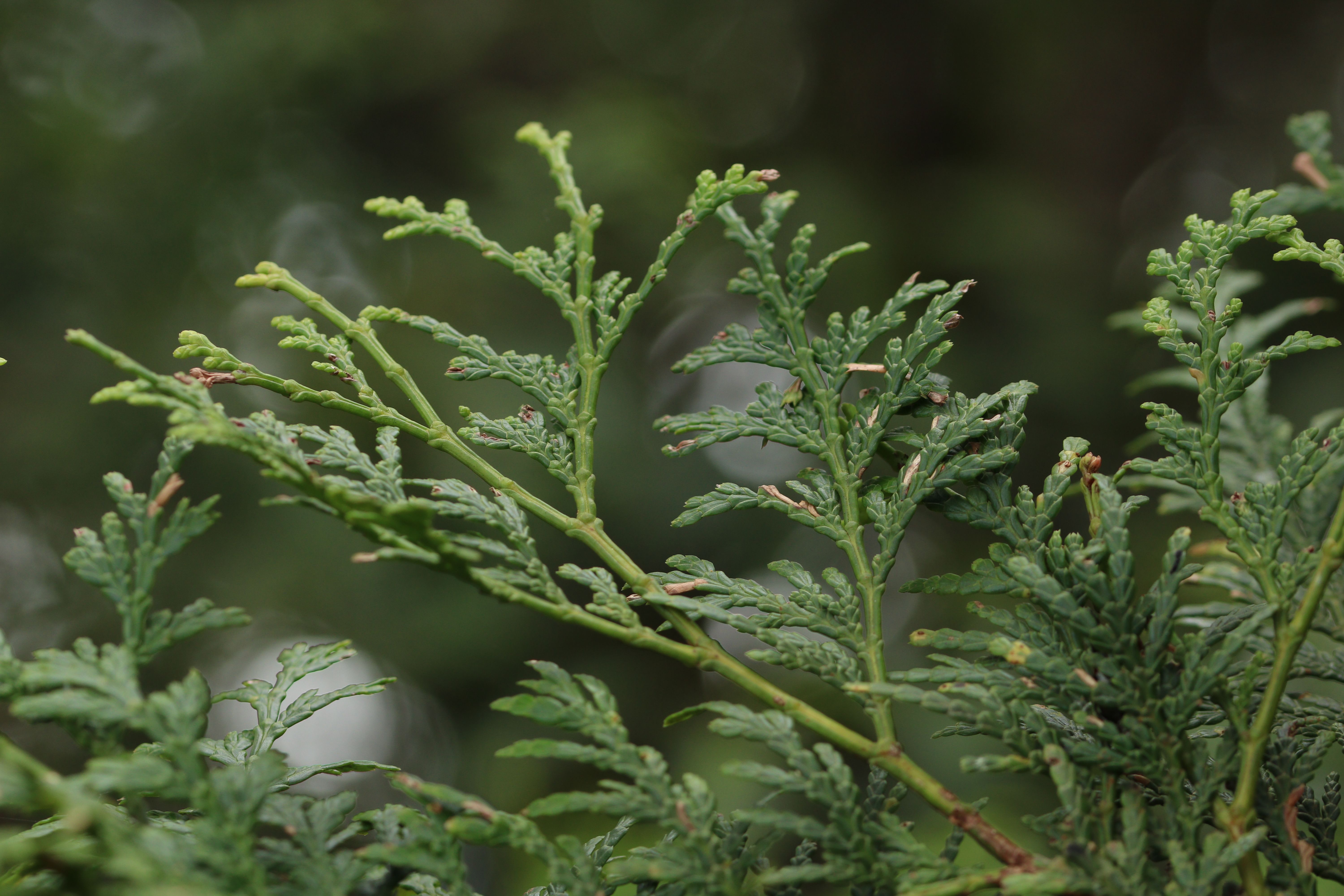 翠柏 Calocedrus macrolepis 树皮灰褐色,呈条状纵裂;鳞叶交互对生,排成平面,背面具白色气孔带,小枝扁平如扇。球果长圆形,长 1-2 厘米,成熟时褐色,种子具翅。为中国特有珍稀树种,分布于云南、贵州、海南等地。