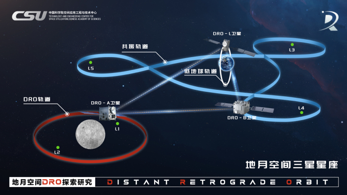 2022年2月,中国科学院启动实施A类战略性先导专项“地月空间DRO探索研究”,提出自主创新、新颖独特、简洁可行的地月空间大尺度三星星座规划。2024年2月3日,经奋力攻关,该先导专项首颗试验卫星DRO-L,成功进入太阳同步轨道,并正常开展相关实验。