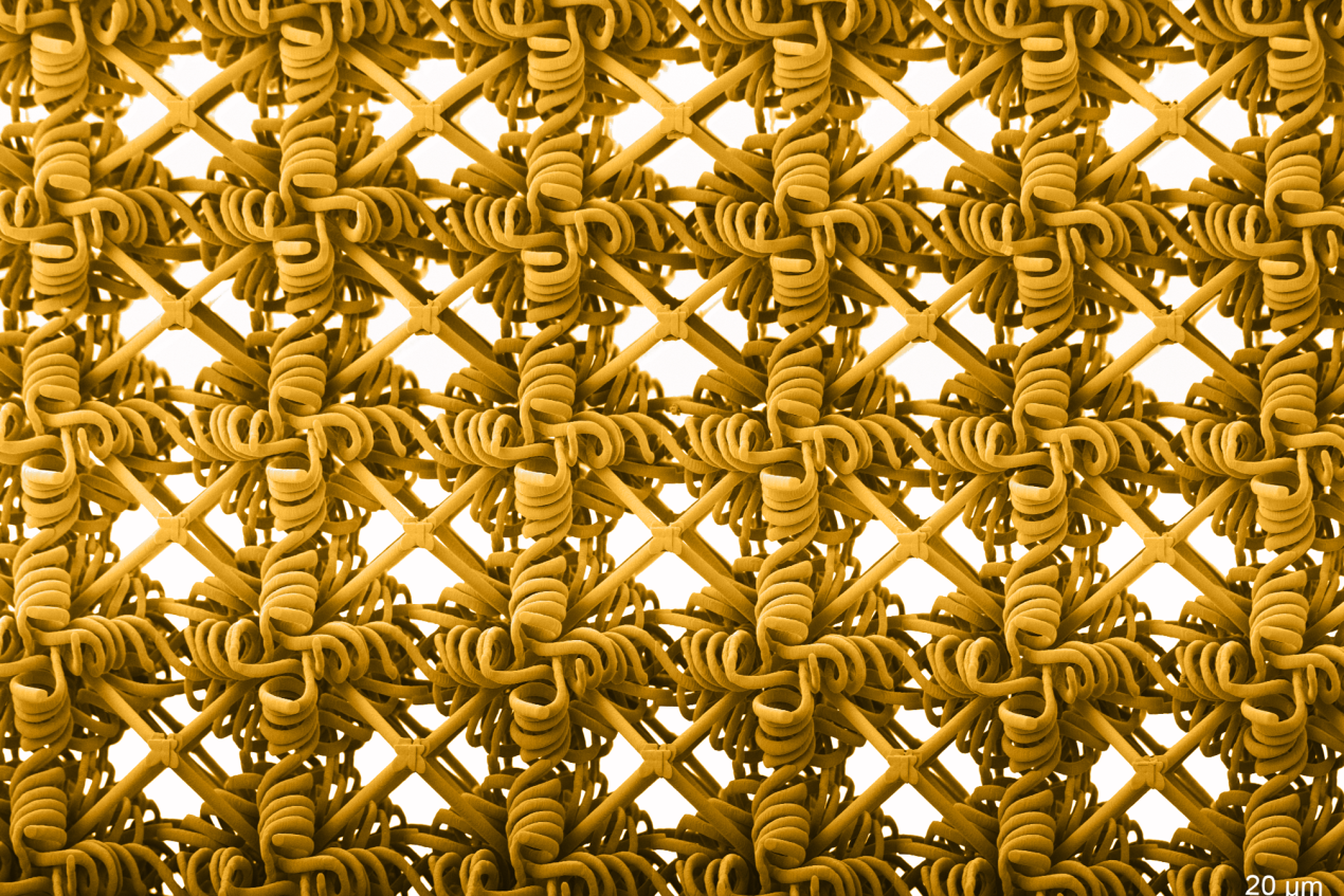 该团队通过结合两种微观结构创建了这种超材料:一个是刚性的网格状支架,由支柱和桁架组成;另一个是由线圈组成的结构,环绕着每个支柱和桁架。这两种材料均由同一种丙烯酸塑料制成,并使用高精度激光打印技术——双光子光刻一次性完成。