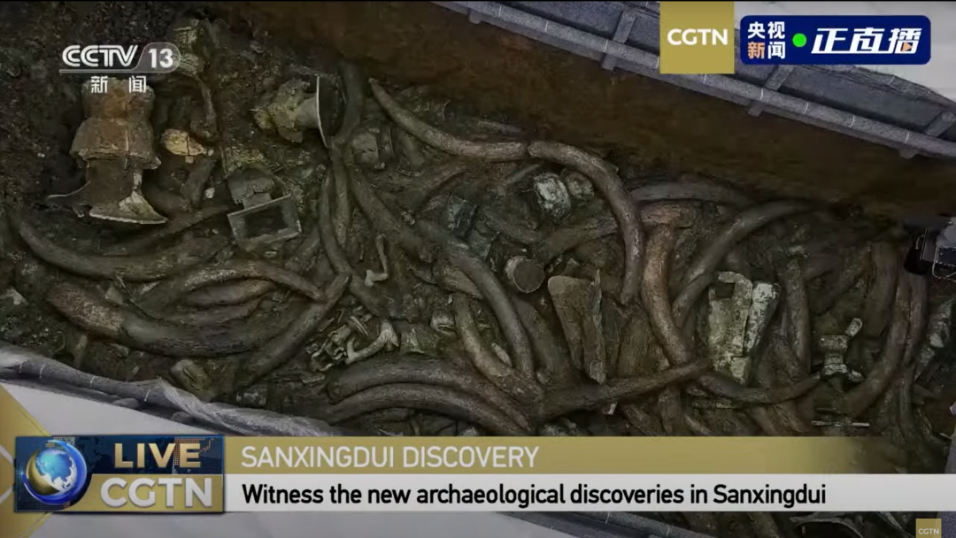 三星堆祭祀坑考古直播中出现满坑的象牙 图/央视直播截图