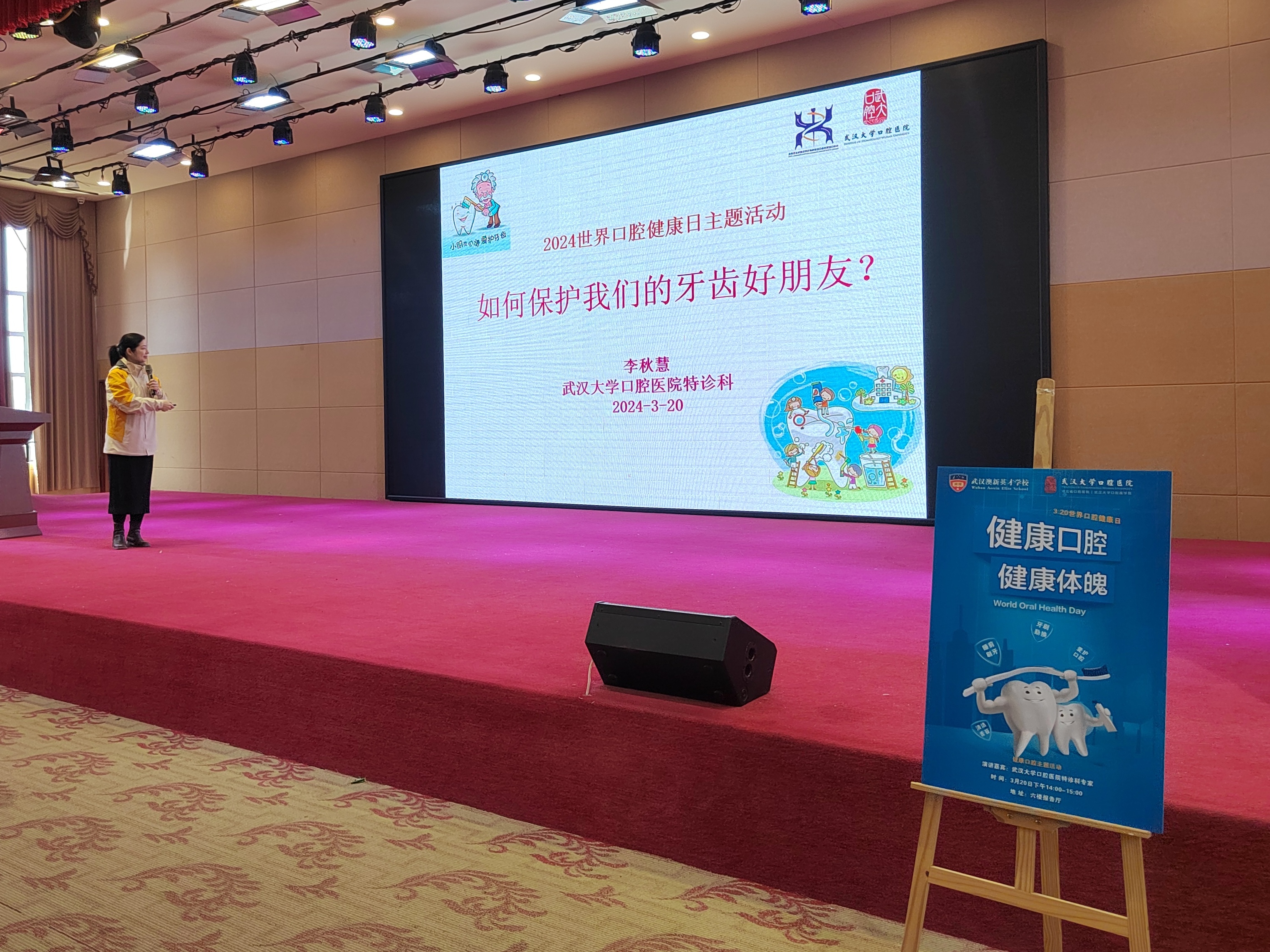 三月,微风渐暖,万物复苏。在2024年3月20日世界口腔健康日的这一天,由保健处林斌处长带队,中华口腔医学会口腔遗传病与罕见病专委会秘书李秋慧教授、特诊科李少兰护士长、护士汪意、张含笑及保健处杨琼组成的武汉大学口腔医院特诊科科普讲座小分队先后前往武汉澳新英才学校、湖北省农村信用社联合社开展了两场“口腔健康知识”系列之世界爱牙日主题科普讲座活动。