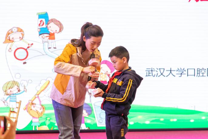 武汉澳新英才学校小学部是本次巡讲活动的首站。在讲座开始前,李秋慧教授先向小朋友们提出几个关于口腔方面的小问题,小朋友们倍感兴趣,纷纷举手,跃跃欲试,现场气氛立马变得活跃起来。然后,李秋慧教授将复杂的口腔知识通过小故事等方式向小朋友们讲解了牙齿的结构、萌生、龋齿的产生和预防、牙齿受伤了该如何处理以及如何保护好牙齿等口腔相关健康知识。小朋友们被李秋慧教授生动有趣的讲解深深吸引。