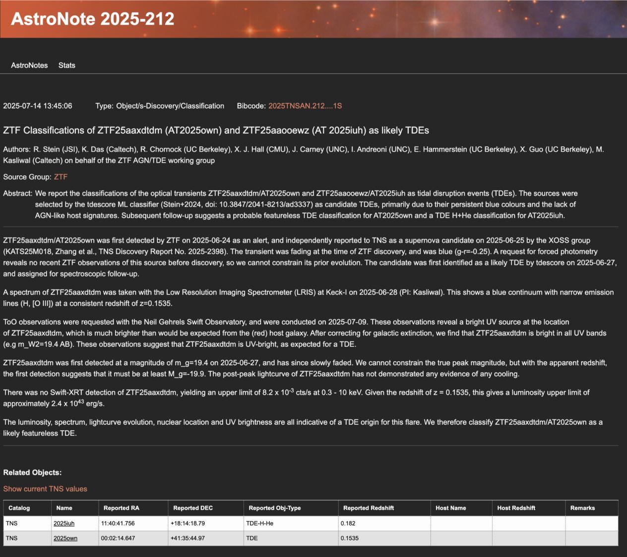 随后,他们又发布了2025年第212号天文简报(AstroNote 2025-212),列出了TDE 2025own(ZTF内部编号ZTF25aaxdtdm)及另外一个潮汐瓦解事件,以下是与TDE 2025own相关部分的翻译(完整内容见参考资料2):